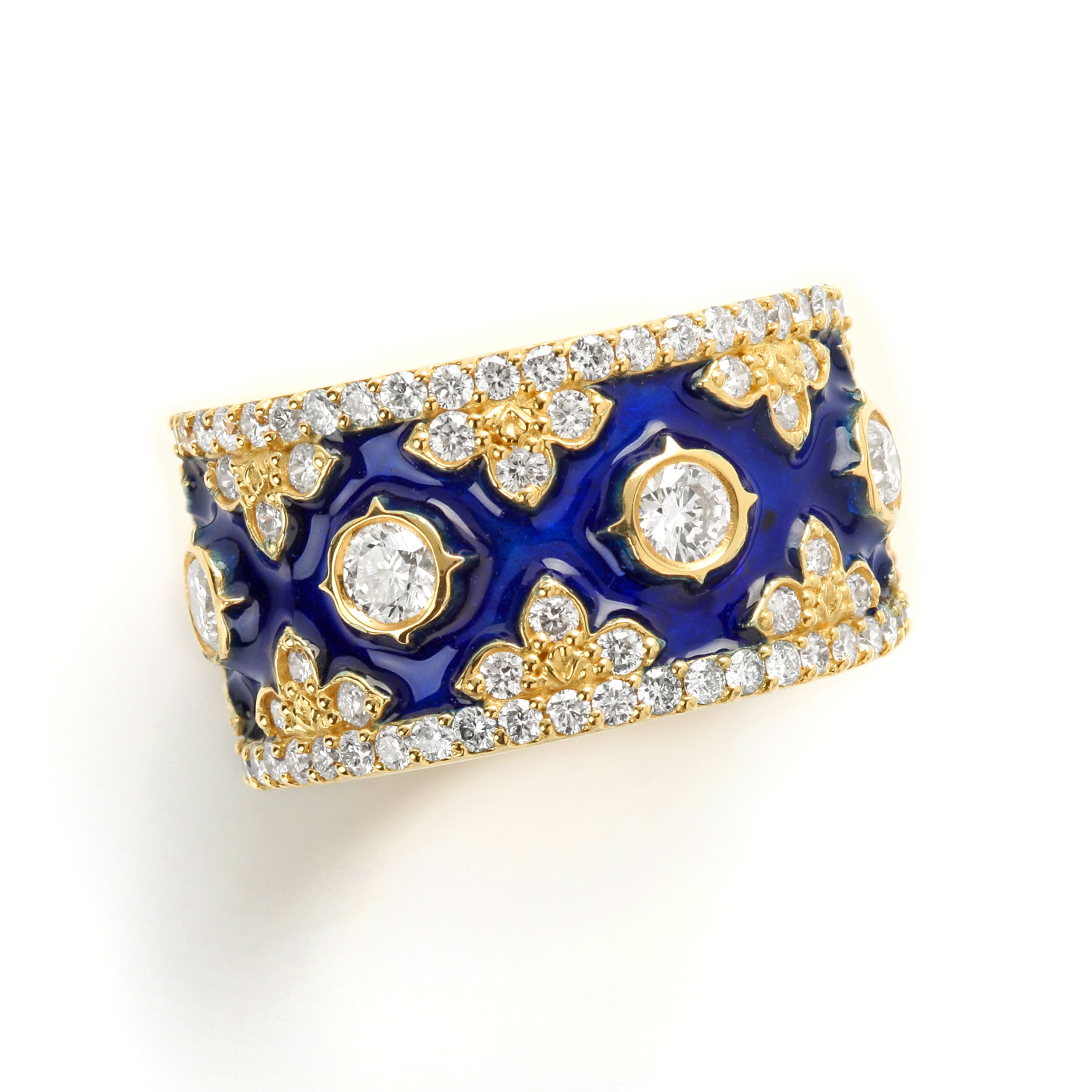 • “Colors of Life” 18K Gold and Diamond Cigar Band Ring with Cobalt Blue Enamel