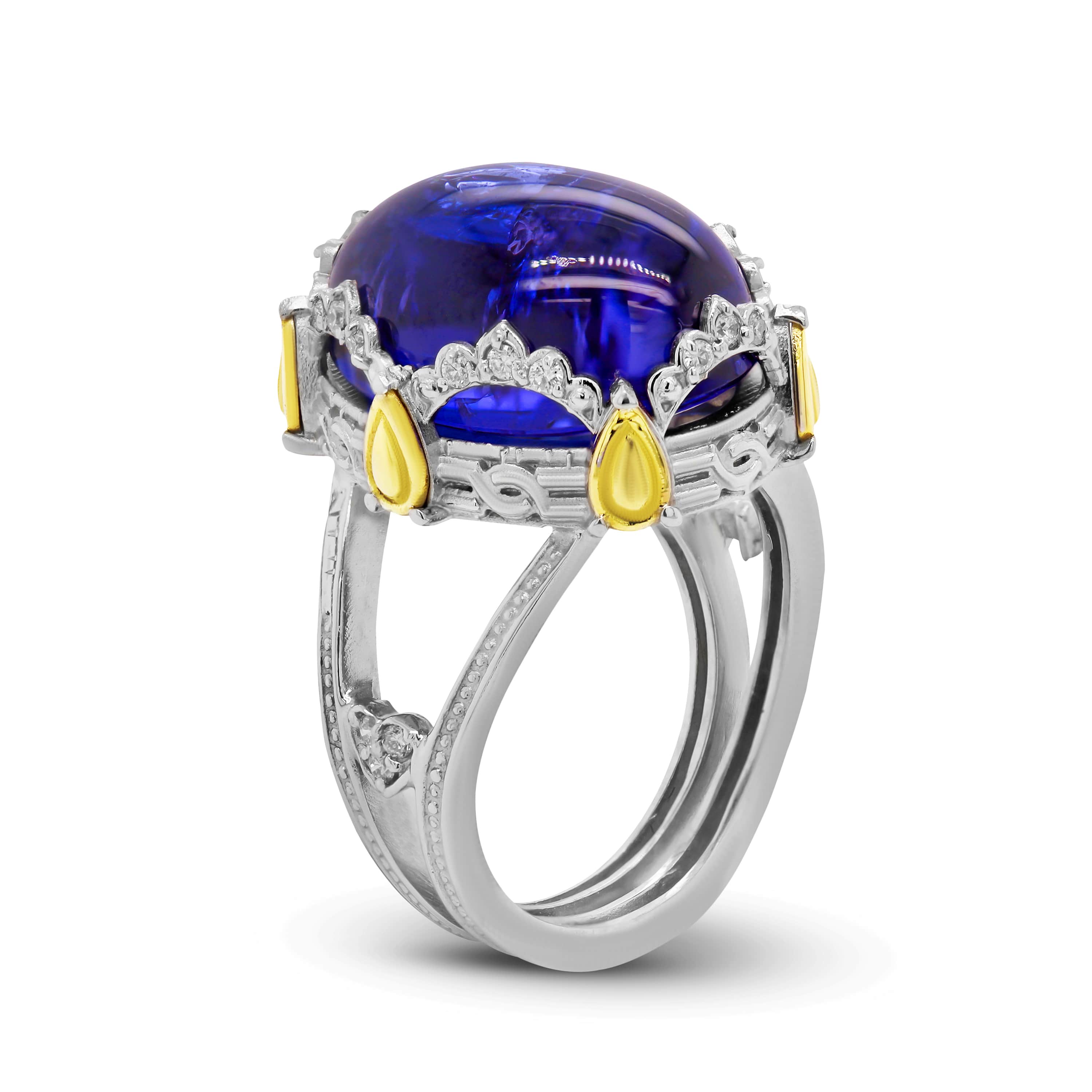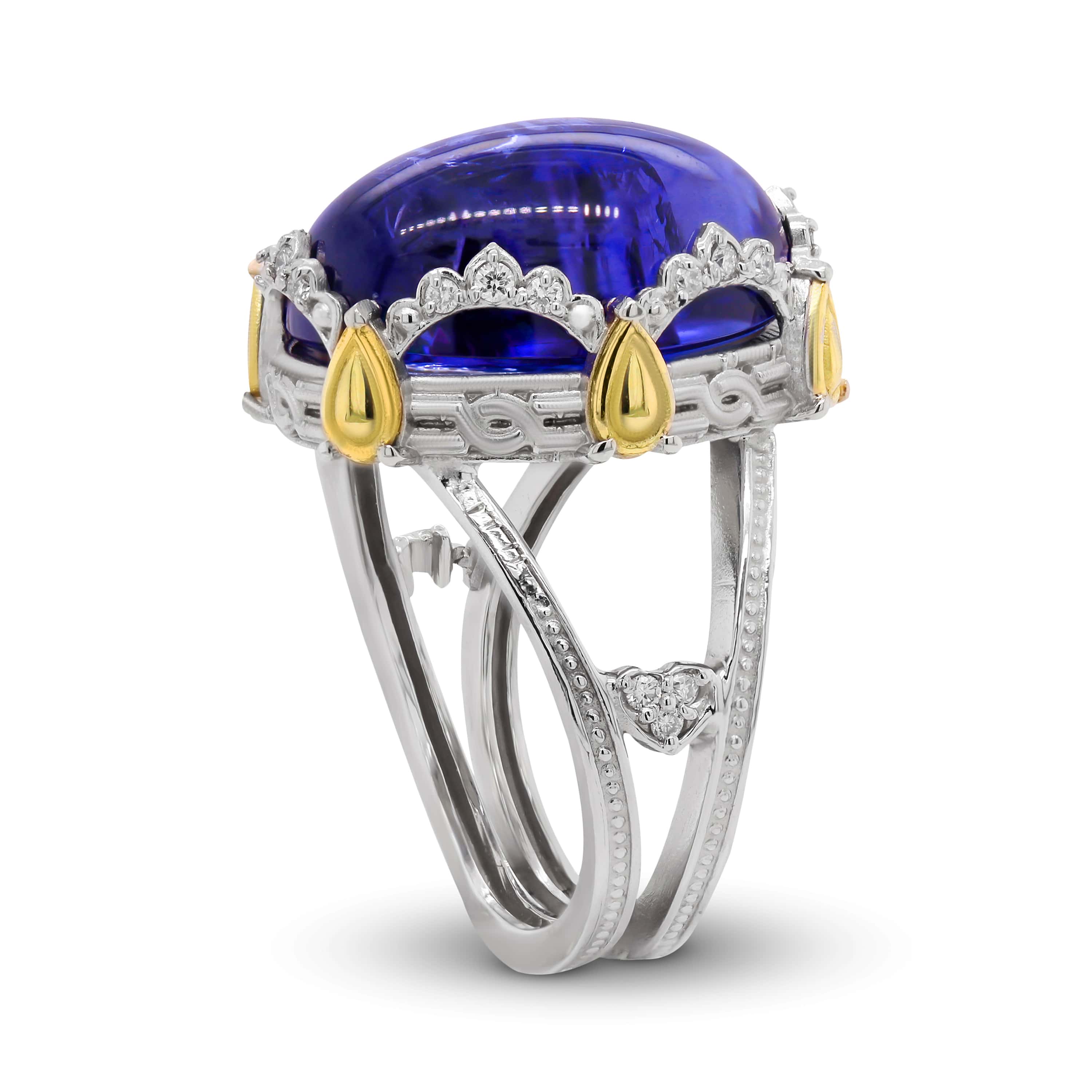 18K TWO-TONE GOLD DIAMOND RING WITH CABOCHON TANZANITE CENTER