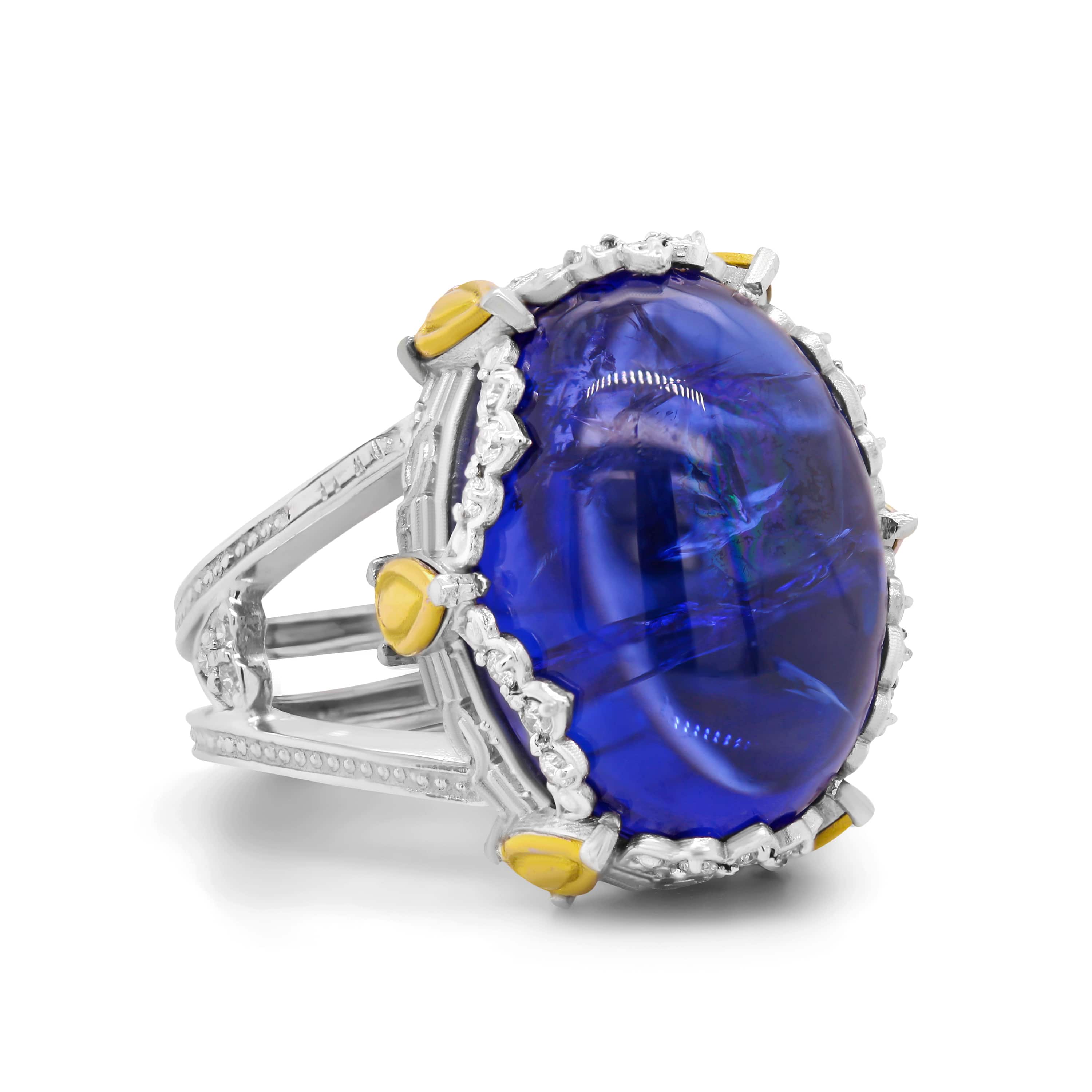 • 18K White Yellow Gold and Diamonds Ring with Cabochon Tanzanite center