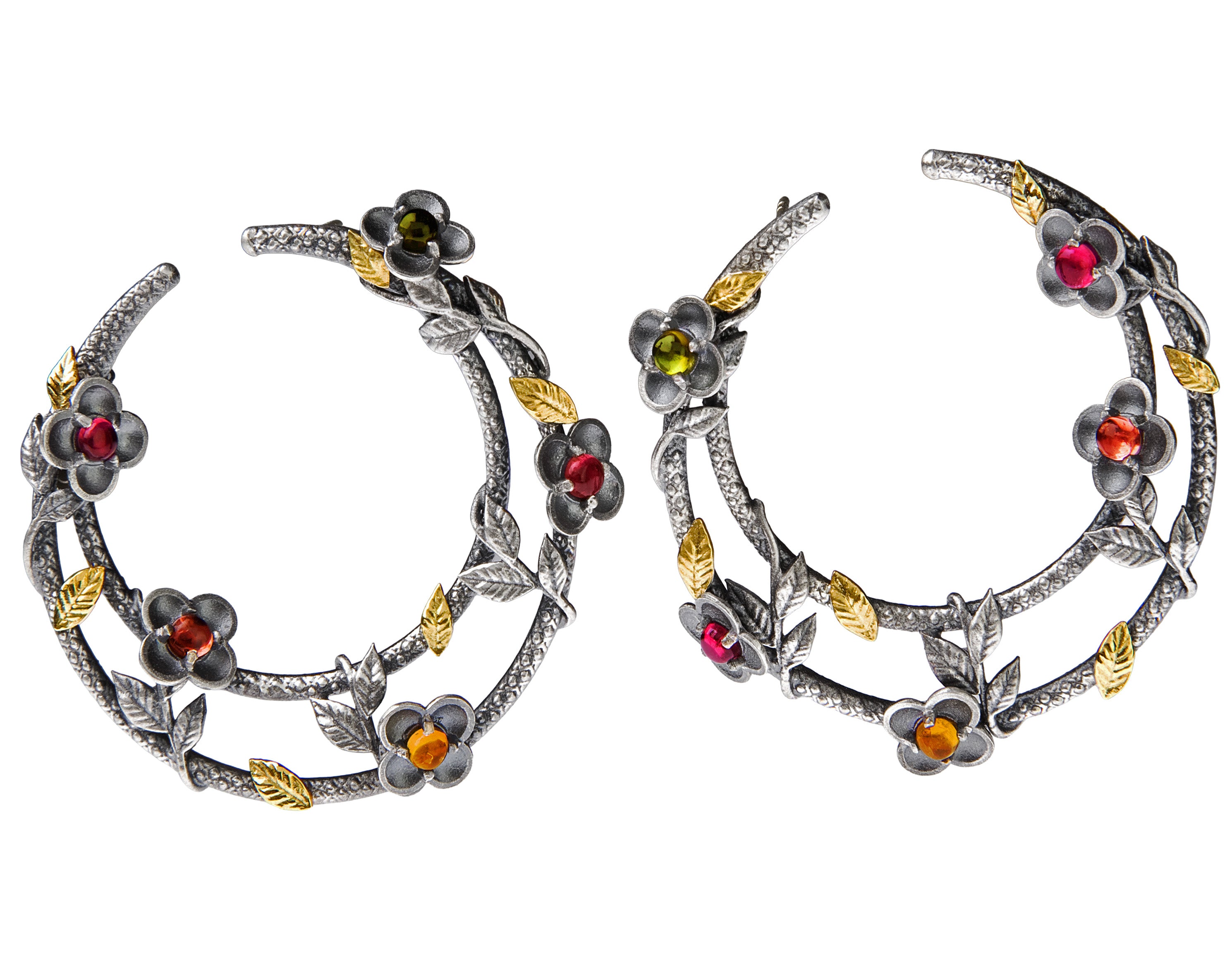 AGED SILVER 18K GOLD TOURMALINE FLORAL SIDE HOOP EARRINGS