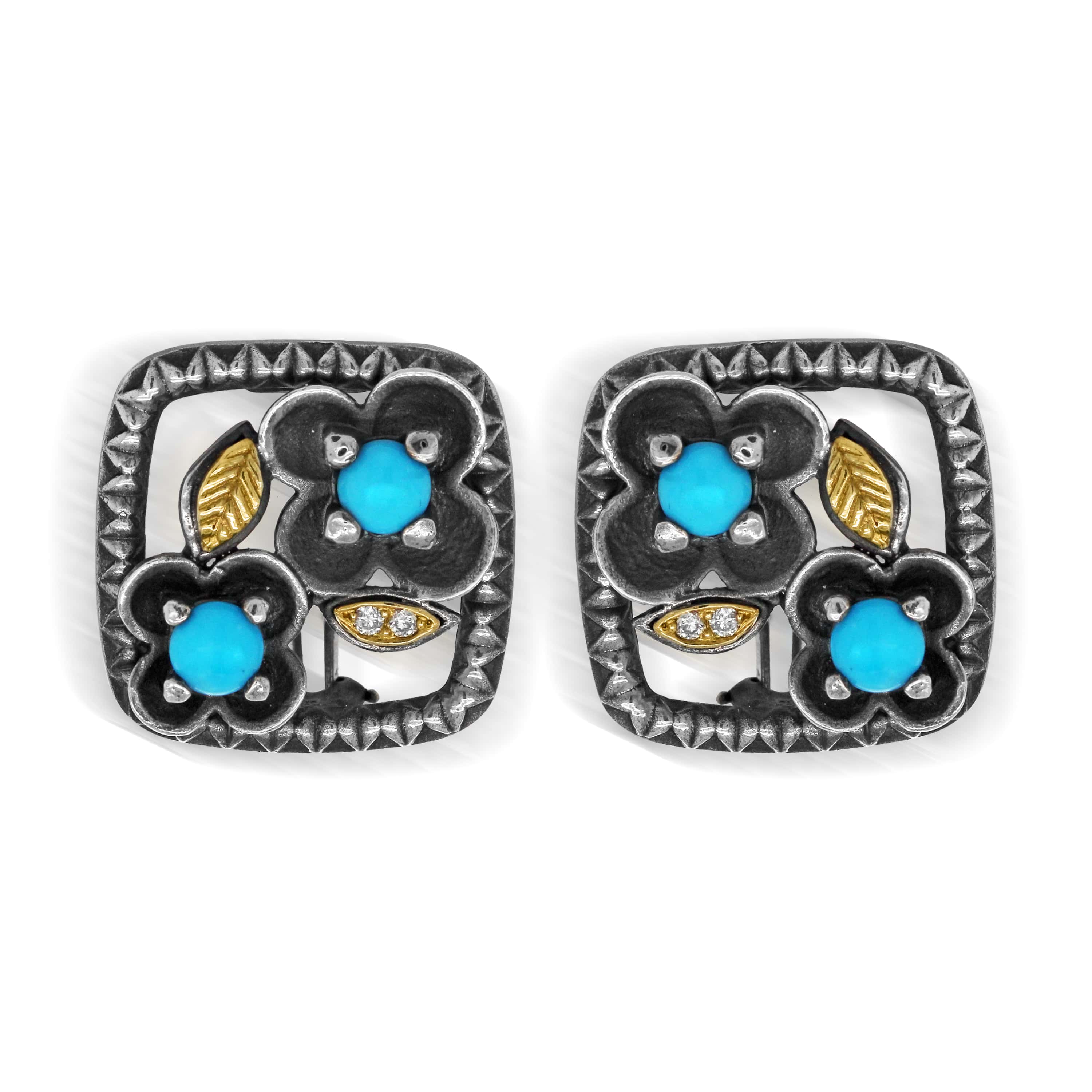 • "Beginnings" Aged Silver & 18K Gold Floral Earrings with Sleeping Beauty Turquoise and Diamonds