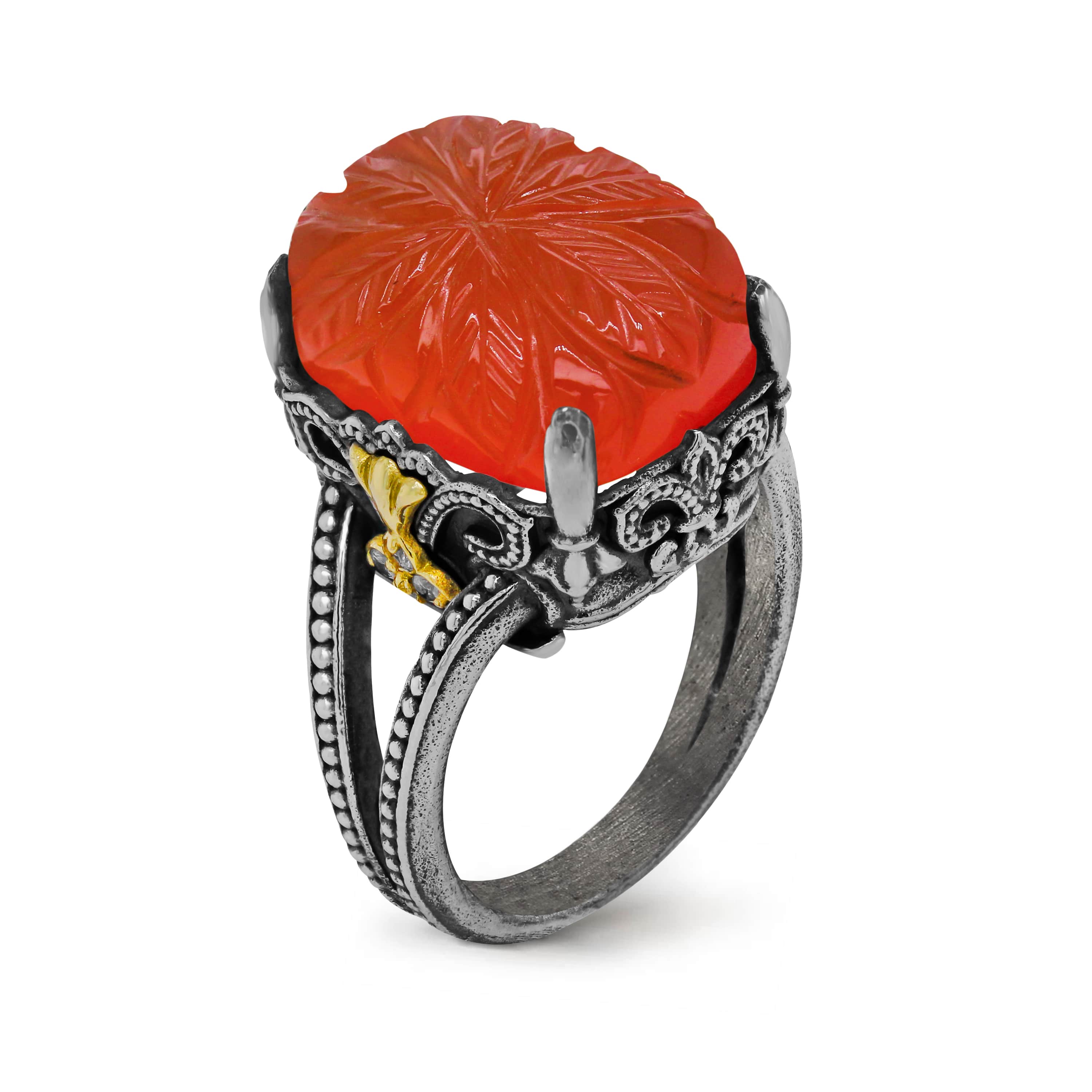 • "Beginnings" Aged Silver & 18K Gold Diamond Ring with Carved Carnelian Center