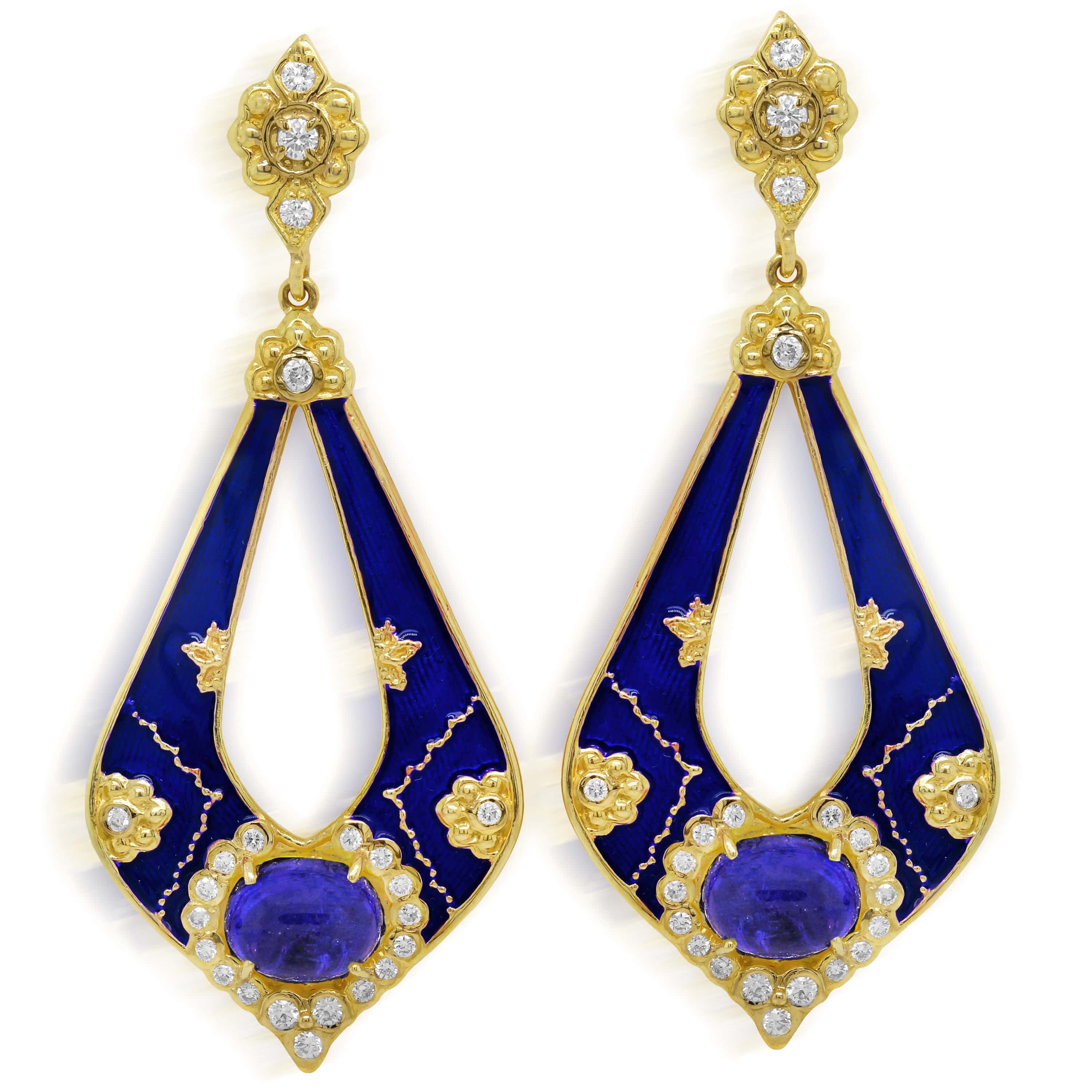 • "Colors of Life" 18K Gold and Diamond Drop Earrings with Cobalt Blue Enamel and Cabochon-cut Tanzanites