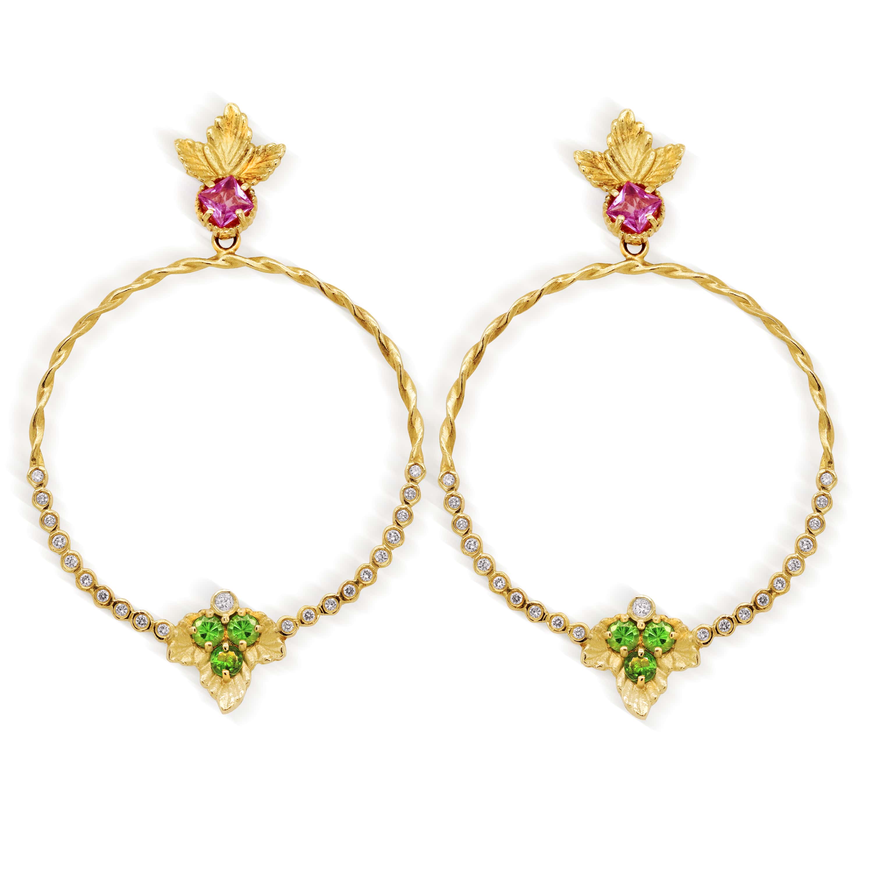• "Enchanted Garden” 18K Gold Floral Circle Dangle Earrings with Pink Sapphires, Tsavorite Garnets and Diamonds