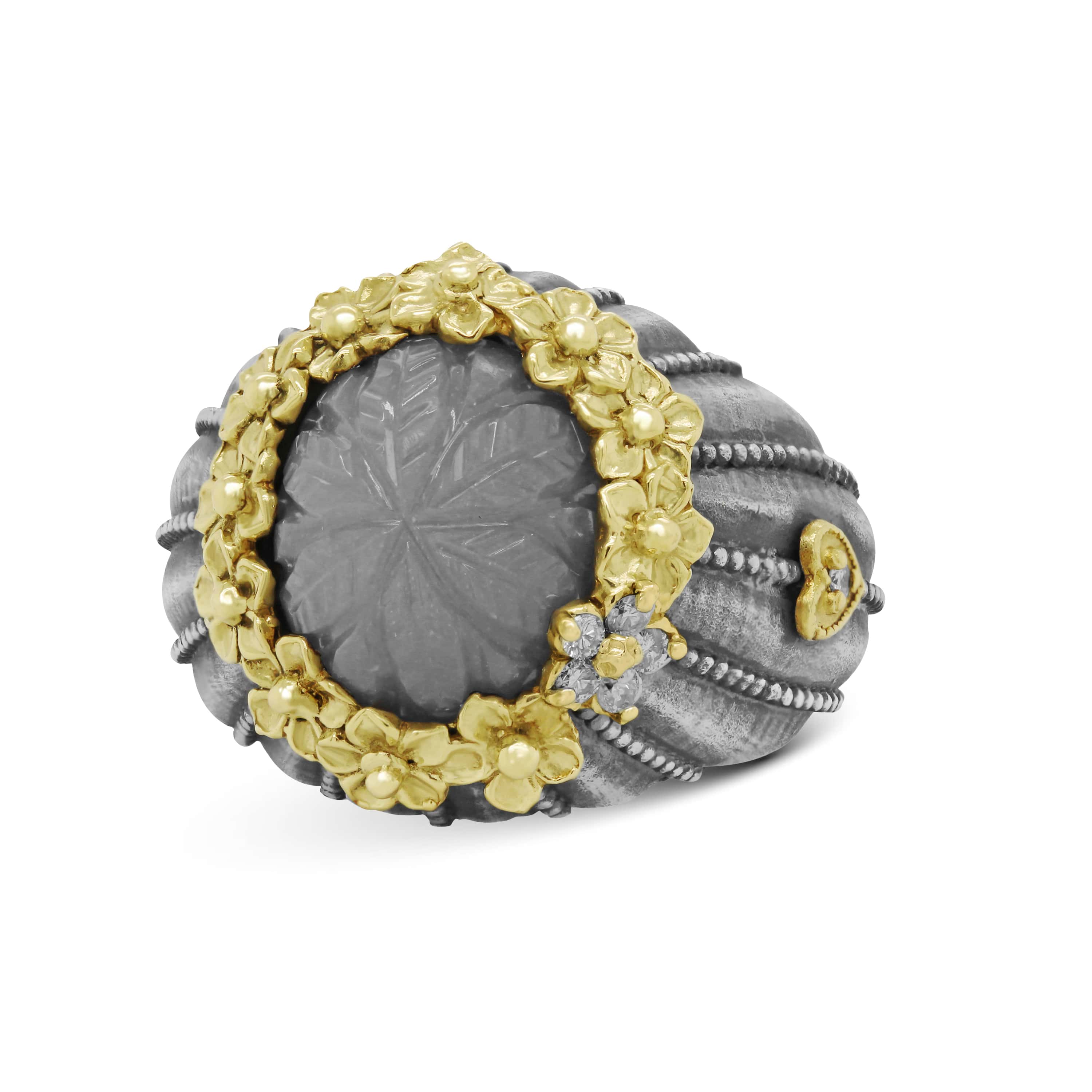 • "Bouquet of Dreams" Aged Silver & 18K Gold and Diamond Flower Ring with Floral Carved, Grey Moonstone Center