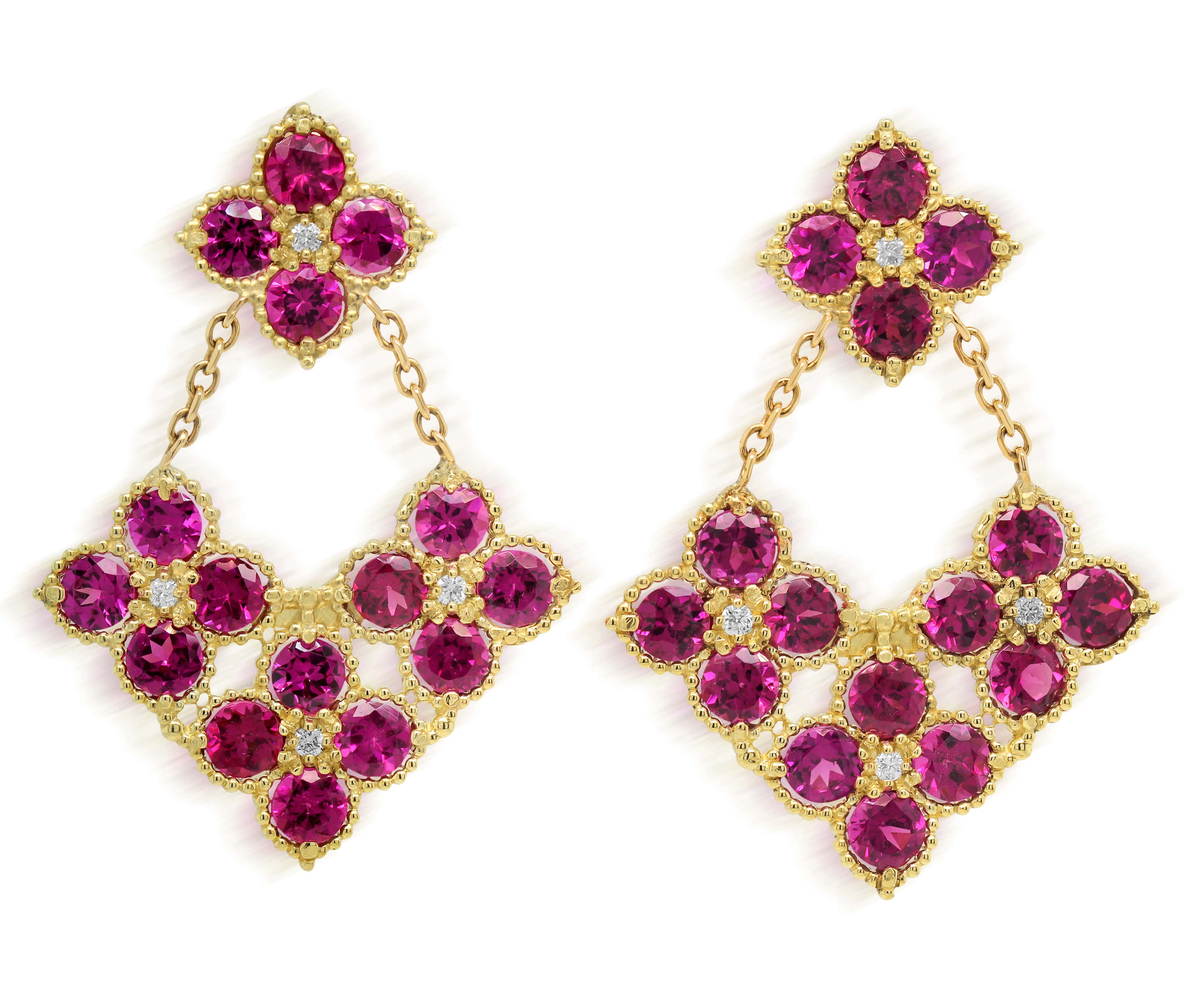 • "Happiness" 18K Gold and Diamond Earrings with Magenta Garnet
