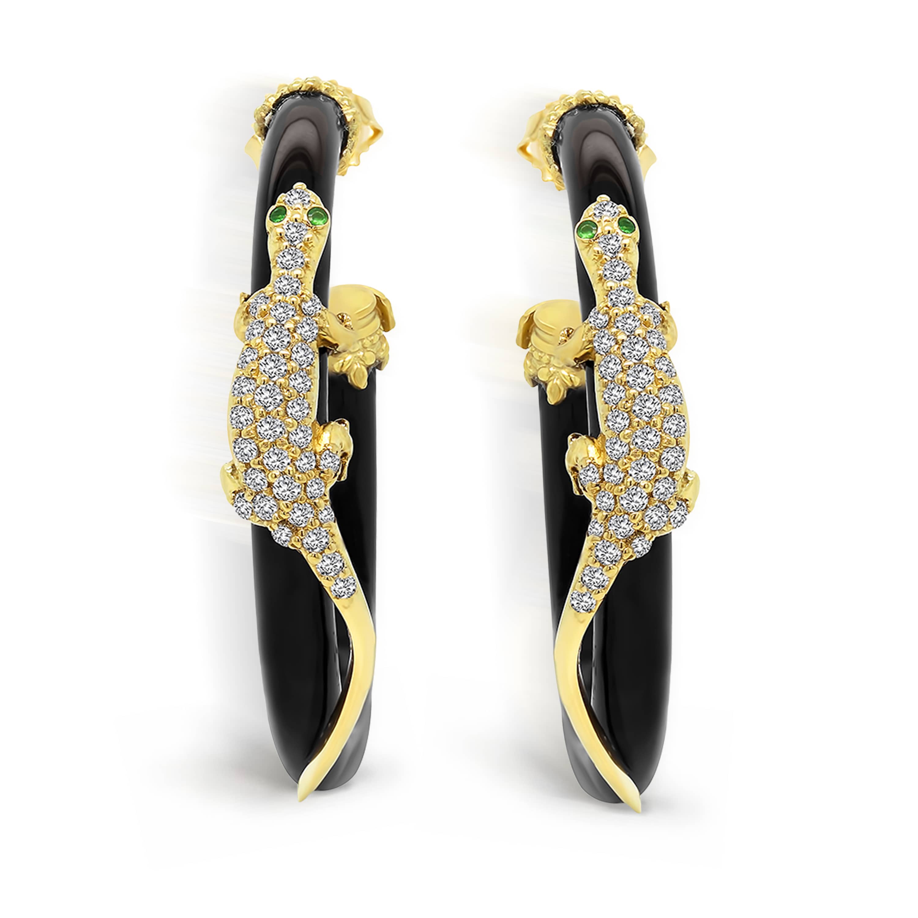 LIZARD 18K GOLD DIAMOND ONYX HOOP EARRINGS