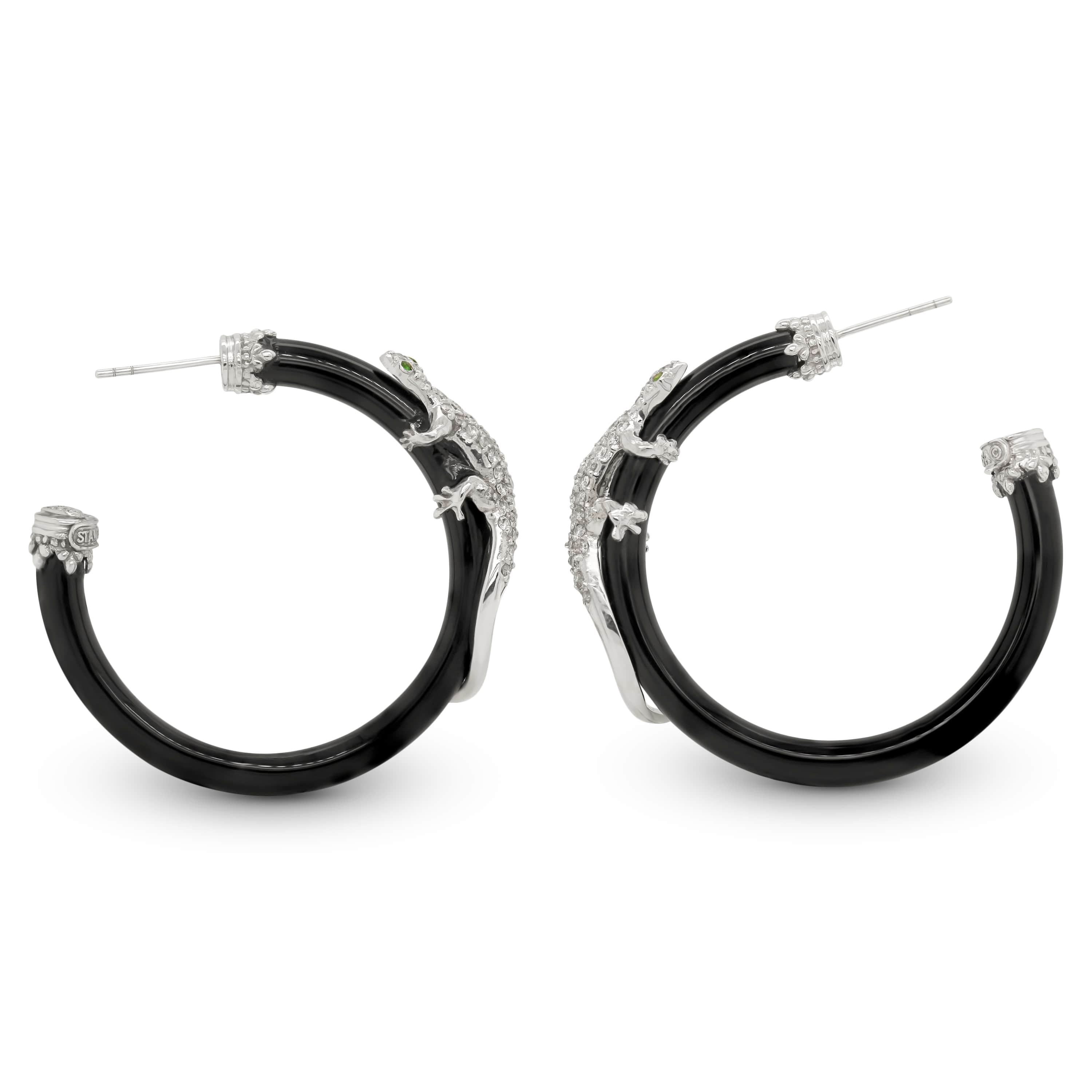 LIZARD 18K WHITE GOLD DIAMOND ONYX HOOP EARRINGS