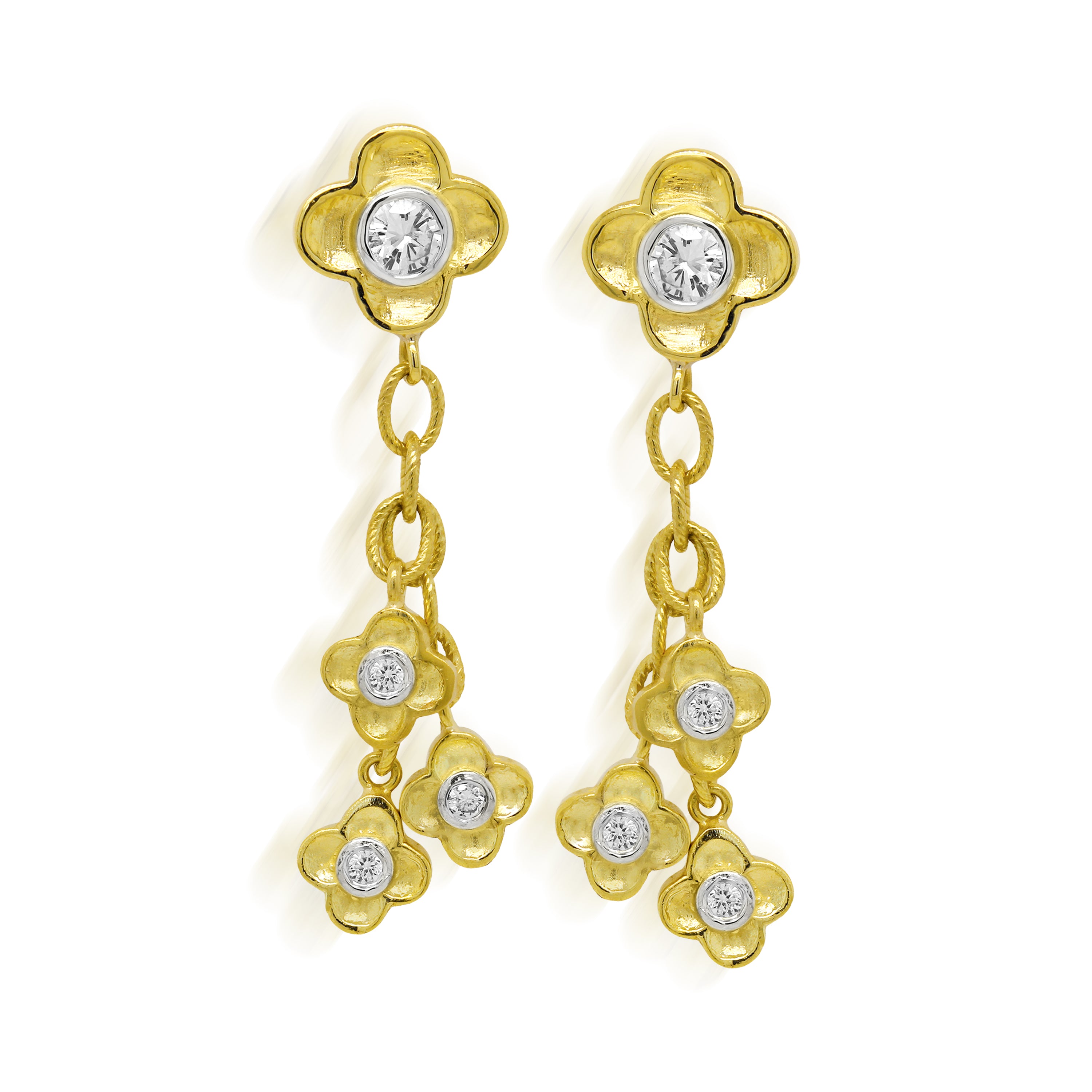 Each flower is accented with brilliant-cut diamonds, capturing the glint of morning dew on new petals. The twisting silhouette evokes the gentle movement of wind through blossoms—elegant, feminine, and eternally fresh.