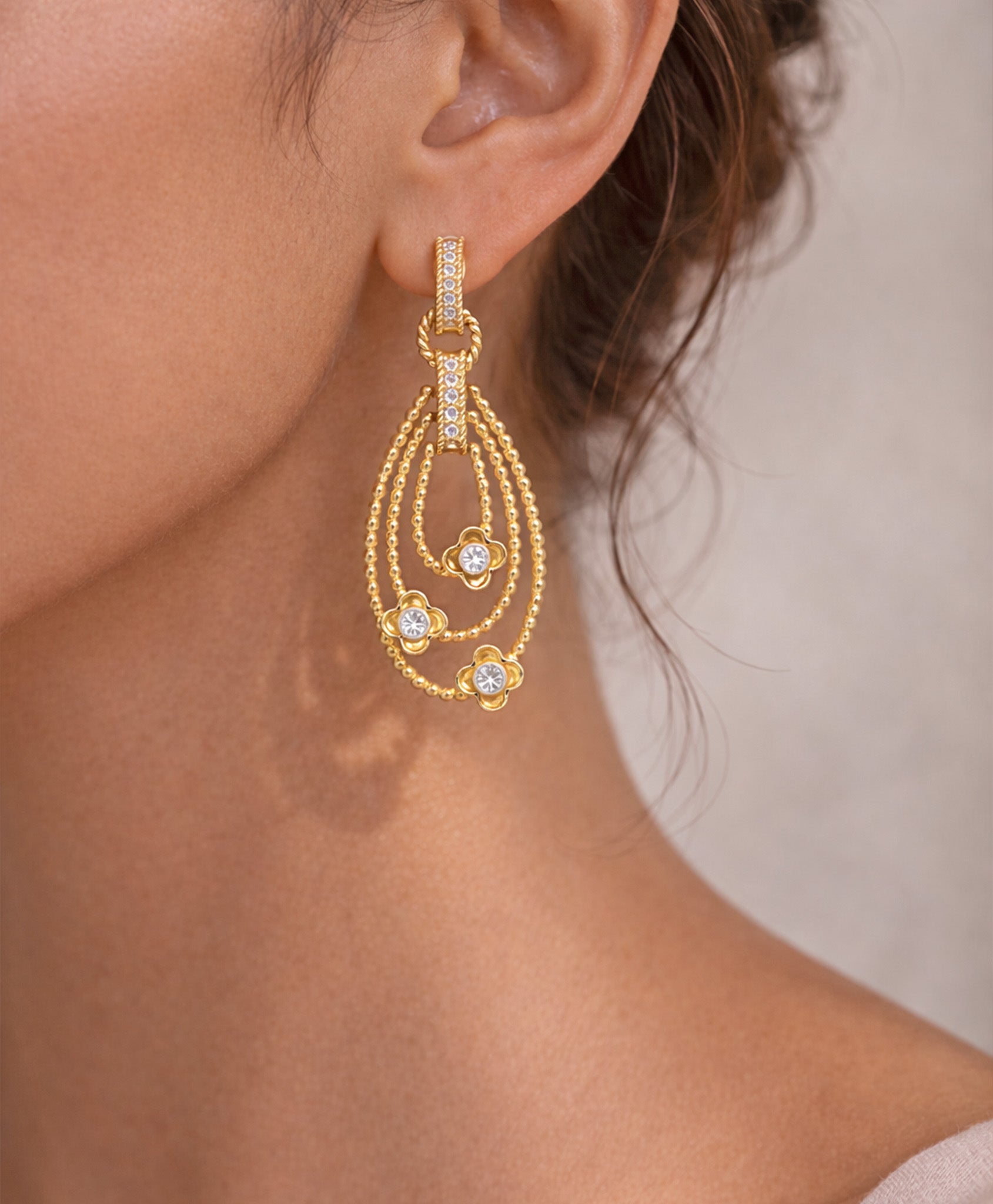 Each flower is accented with brilliant-cut diamonds, capturing the glint of morning dew on new petals. The twisting silhouette evokes the gentle movement of wind through blossoms—elegant, feminine, and eternally fresh.