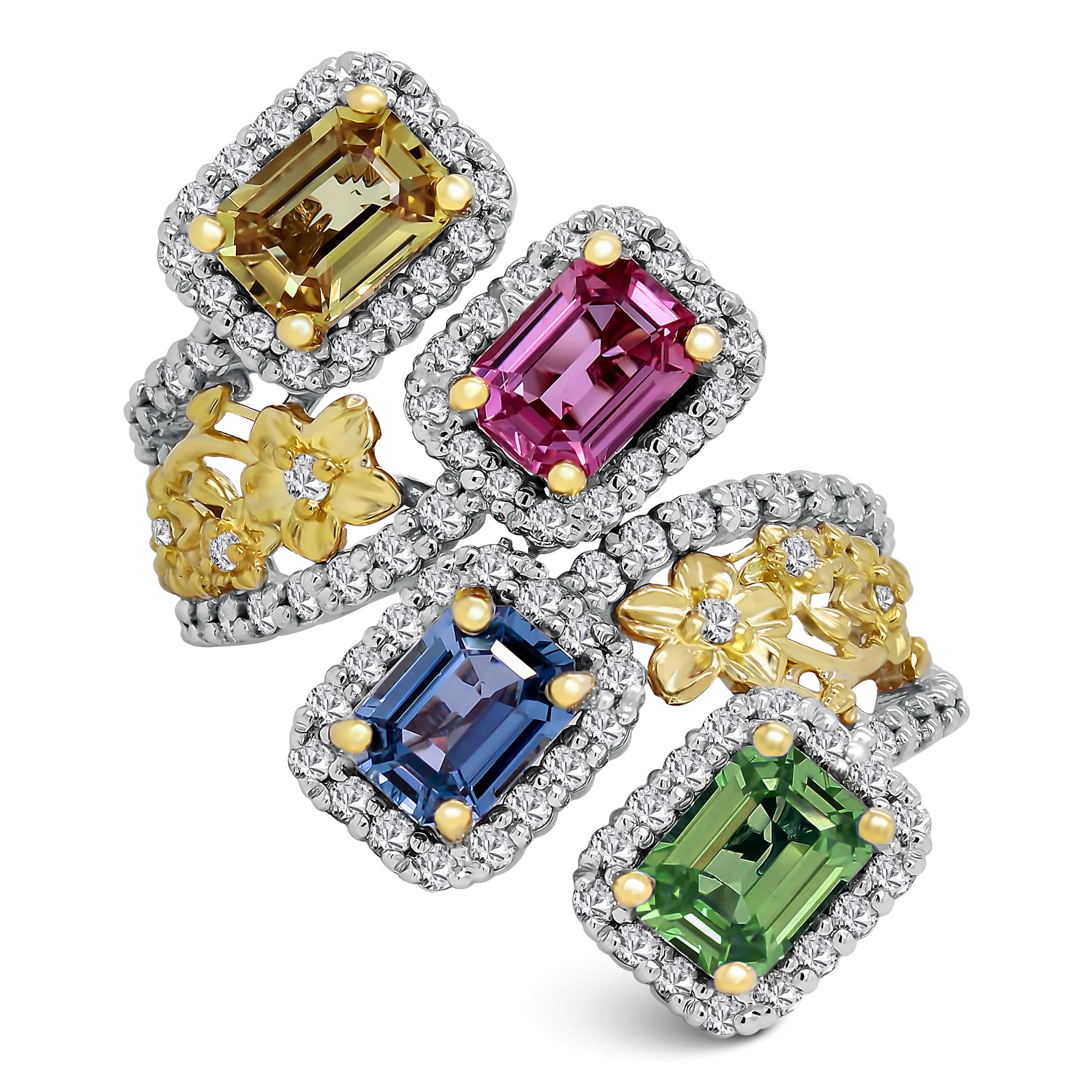 • "Mayflower" 18K Two-Tone Gold and Diamond Floral Band Ring with Multi-color Sapphires