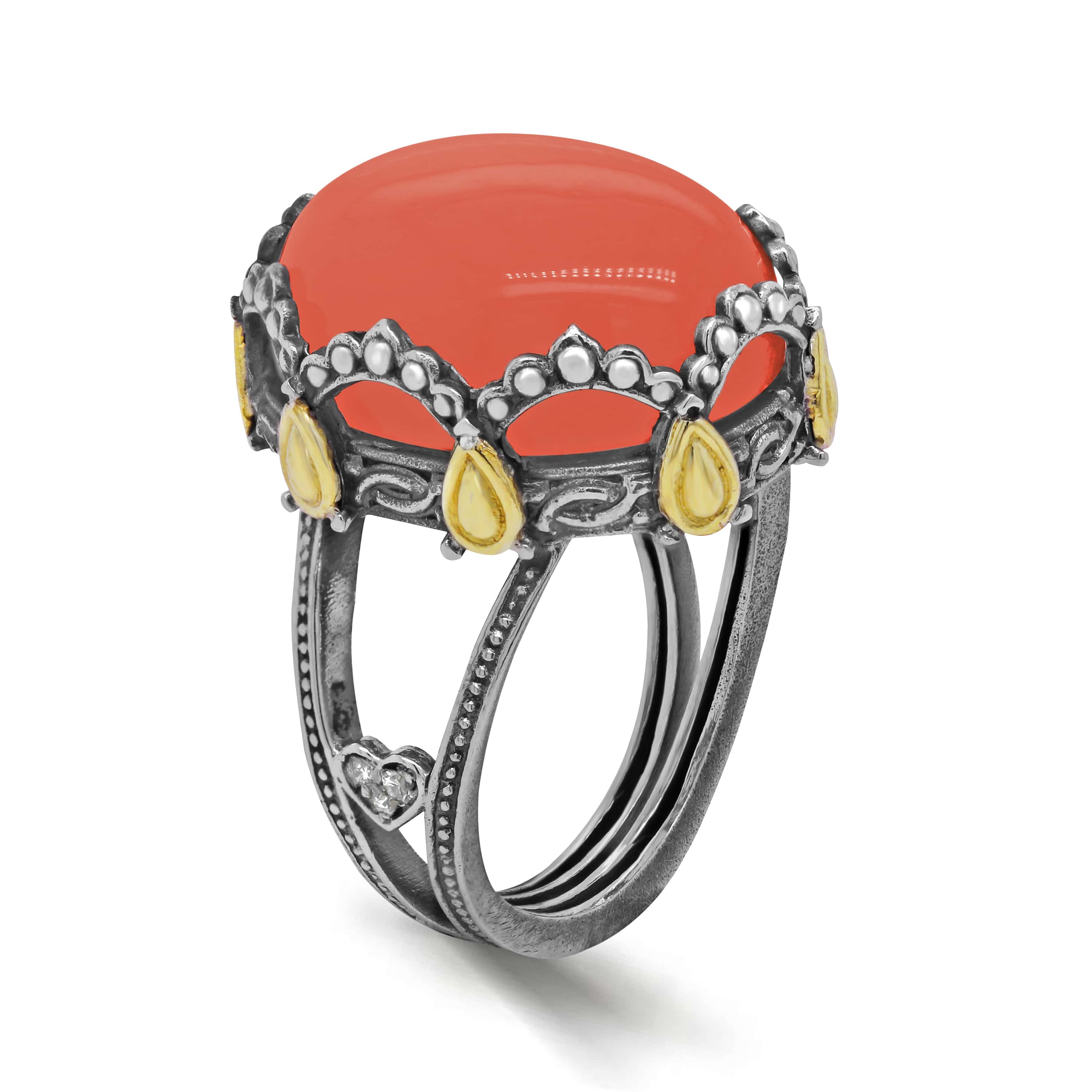 • "Princess Tiara" Aged Silver & 18K Gold Ring with Carnelian Center