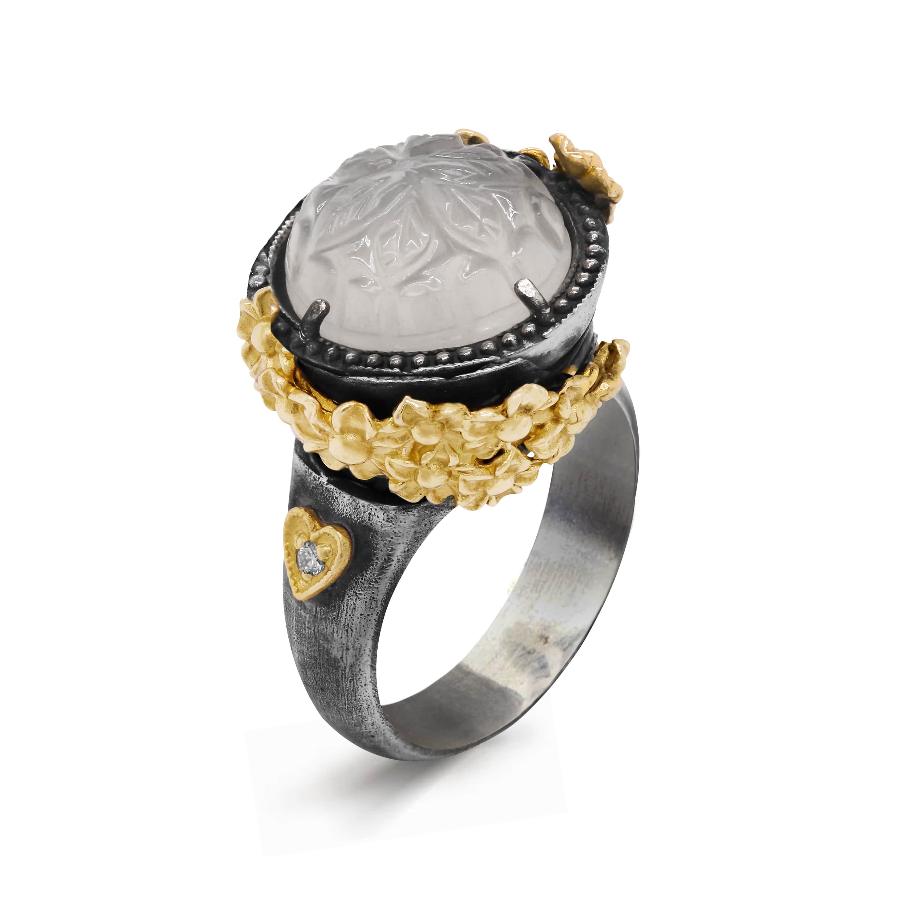 ROSE GARDEN FLORAL CARVED MOONSTONE AGED SILVER 18K GOLD RING