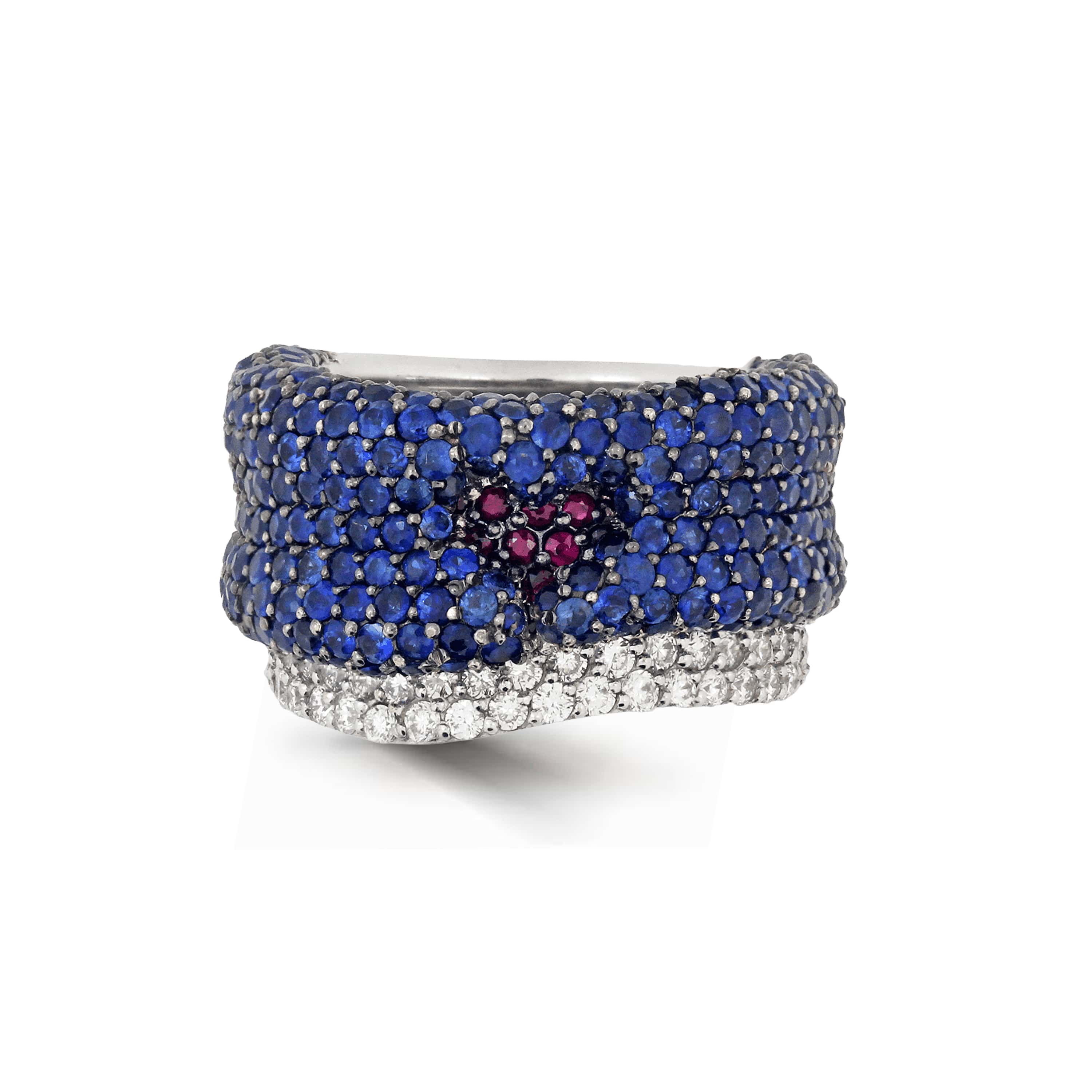 SECRET LOVE 18K WHITE GOLD BLUE SAPPHIRE RUBY DIAMONDS BAND RING